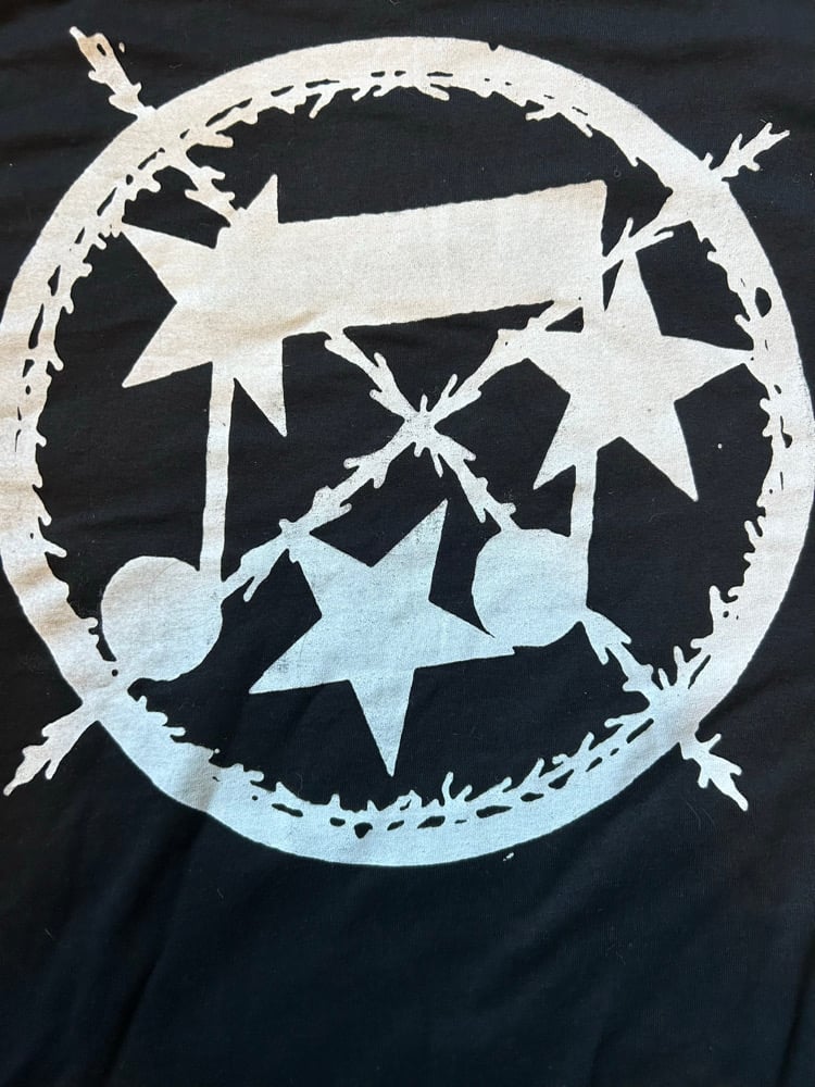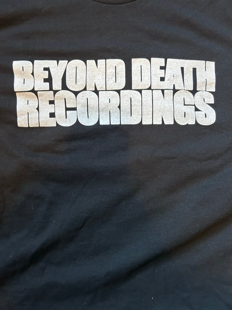 Black t-shirts with white screen print. Front side bears the BEYOND DEATH impact print, while the back side has the large Tennessee Noise logo.